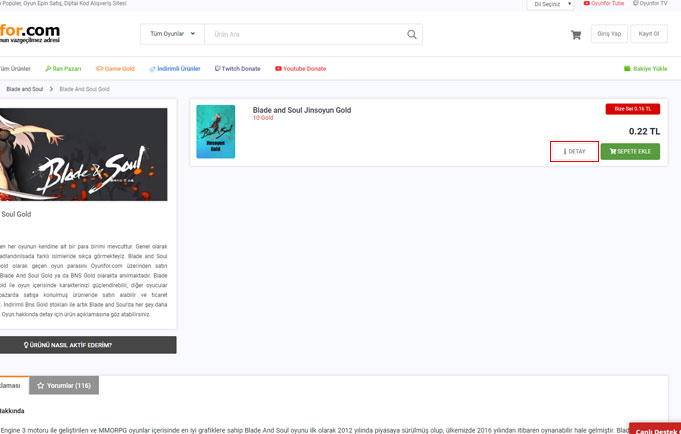1.ADIM Blade and Soul kategorisinden seçtiğiniz ürünün "Detay" butonuna tıklayınız.
