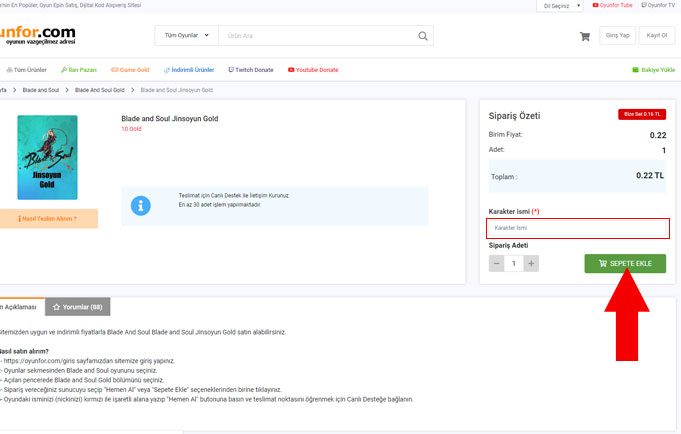2.ADIM Karakter isminizi girerek "Sepete Ekle" butonuna tıklayınız.