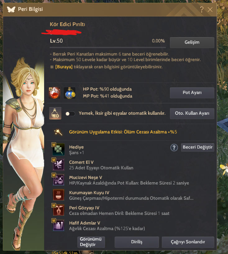 Çadır ve peri vardır. Perinin tüm skilleri son seviye. Mana potu için 290 parça toplandı son 10 parça kaldı.