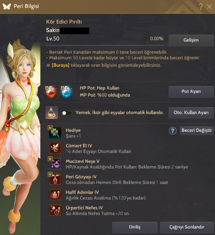 En üst seviye Berrak peri mevcuttur 50seviyedir ve önemli skillerinin hepsi mevcuttur.Fotoğrafta yer almaktadır.