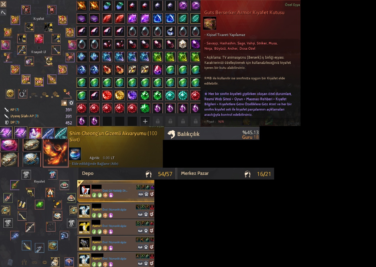 Hesapta 24 adet class bulunmaktadır, balıkçı hesabında 2k mastery, dayanıklılık düşüş dirençli petler, eserler, 1.3k ve 1k dayanıklık dede cron ve serinrüzgar oltası bulunmakta, günde 2-3b afkden para bırakıyor.
