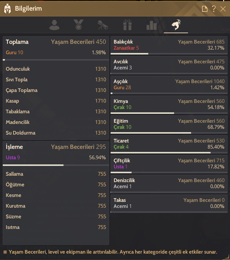 * Hesap toplama hesabıdır. Et toplayarak saatte 400m rahatlıkla kasabilirsiniz *Toplama guru 10 seviyesindedir * 450 adet enerji potu ekstra büyük bulunmaktadır * Aşçılık TRI Manos elbisesiyle birlikte master ı 1260 a çıkmaktadır. yukarde ki fotograflarda elbiseyi görebilirsiniz *Aşçılık guru 28 olmakla birlikte 1,5 aylık valencia yemeği depoda bulunmaktadır. Günde 200m teslimat getirisi vardır *Doom atı bulunmaktadır. *3 adet 100 fs 1 adet 130 fs 1 adet 150 fs bulunmaktadır. * Merkez pazarında 7.1b bulunmakla birlikte depoda bir çok satılacak eşyalar mevcut depoda bulunan eşyaların toplam değeri resimde de gözüktügü gibi 17b dir. * 40 günlük değerli paketi , 30 günlük kamaslyve kutsaması bulunamktadır * Petler full aşama 4 kirpiside aşama 4 tür çoğu petde yaşam exp buffı bulunmaktadır *Kitap görevleri yapılmıştır. *Çoğu karakterin envanter ağırlık ve kamuflaj harcamaları yapılmıştır. *2 şer adet ana silah , uyanış , alt silah takas kuponu bulunmaktadır * Full pen tuvala set pen capotia yüzük pen capotia kemer bulunmaktadır. hesap 252 ap 308 dp dir *15-16 karakter mevcutrur 3 karakter 62 level çoğu karakter 61 leveldir * İşte çalıştığım için ilgilenemedim ve satmayı düşünüyorum.