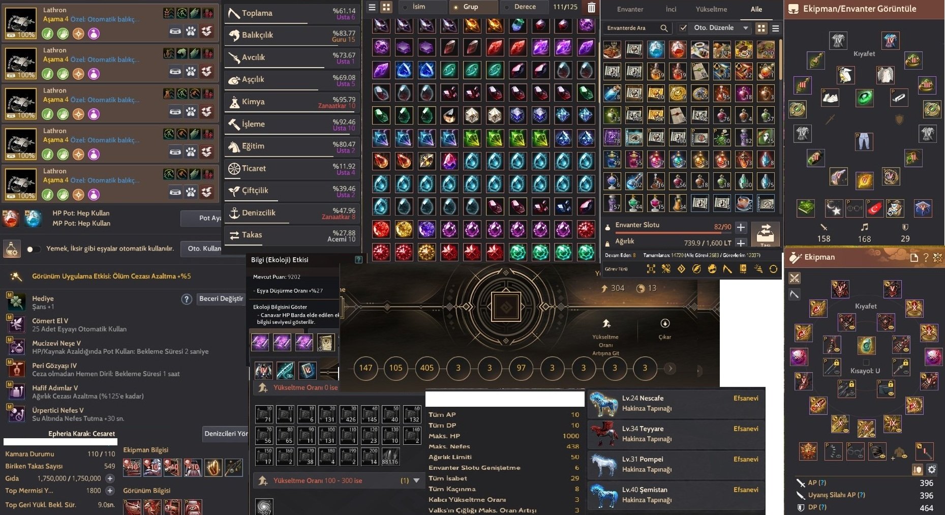 Ptw oltası mevcut Balıkçılık için dayanıklılık dirençli petler mevcut 3 adet denge ve 1 adet exp takas kuponu Peri max seviye Karak cesaret 10 mavi itemli Efsanevi atlar mevcut kragdalo mevcut