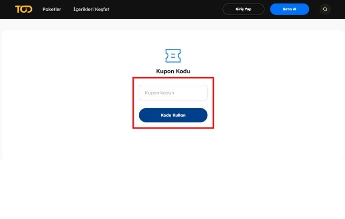 Kodun aktive edilmesi için www.todtv.com.tr sayfası ziyaret edilmeli ve sayfanın en altında yer alan ''KUPON KODU'' alanına ya da https://www.todtv.com.tr/kupon-kodu linki tıklanarak ilgili alana tarafınıza ulaşan Kupon Kodu girilmeli ve son olarak da ücretsiz üyelik işlemleri tamamlanmalıdır.Kupon Kodu’nun aktive edildiği anda, satın alınan paket anında aktif olacak ve 1 Ay boyunca Eğlence Paketi içeriklerinin izleme hakkını verecektir.